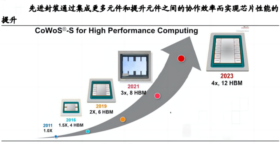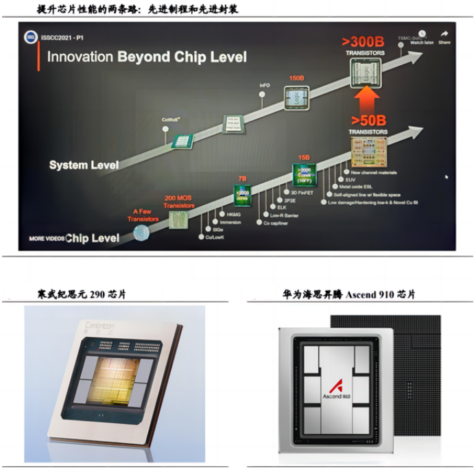 在技术可获得的前提下,提升芯片性能,先进制程升级是首选,先进封装则锦上添花。通常我们可以见到的是,高性能、大算力的芯片,会考虑上先进封装(2.5D、CoWoS等),但这些大算力芯片往往也同时采用的先进制程工艺,也就是说,先进封装/Chiplet应用通常只出现在顶级的旗舰芯片的封装方案选择中,并不是一个普适性的大规模应用方案。比如寒武纪的7 nm AI训练芯片思元290,从芯片宣传图片可以看出,其可能采用“1+4”架构,即1颗CPU/GPU搭配4颗HBM存储的Chiplet封装形式,该芯片也是寒武纪的旗舰芯片产品之一;华为海思昇腾910芯片,采用7 nm的先进制程工艺,从宣传图可以看出,也是采用了多颗芯片堆叠的CoWoS结构,也系Chiplet的一种形式。这些芯片都是在拥有先进制程的基础上,为了进一步提升芯片性能,而采用了CoWoS这些2.5D先进封装技术,说明了先进制程在工艺路线的选择上是优于先进封装的,先进制程是升级芯片性能的首选,先进封装则是锦上添花。
