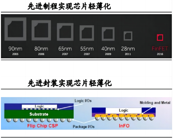 在芯片轻薄化方面,在不牺牲芯片整体性能的前提下,先进制程能够在算力和晶体管数目不变时,通过缩小单个晶体管特征尺寸,实现芯片面积(Die size)缩小;而先进封装,因为封装对晶体管尺寸无微缩的能力,只能通过更精细的材料、更致密的结构来实现轻薄化。比如,手机AP处理器的封装多采用FCCSP的封装形式,其结构包括一个CSP载板,而Fanout(TSMC与APPLE公司合作,APPLE公司的A系列芯片多采用InFO技术封装,即Fannout)封装,取消了CSP载板(CSP载板约0.3 mm厚度),封装后的芯片更轻薄,对整机(手机)结构空间余量有重要提升。