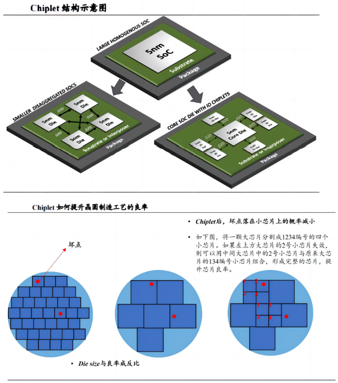 Chiplet可以提升芯片制造的良率。对于晶圆制造工艺而言,芯片面积(Die size)越大,工艺的良率越低。可以理解为,每片wafer上都有一定概率的失效点,对于晶圆工艺来说,在同等技术条件下难以降低失效点的数量,如果被制造的芯片,其面积较大,那么失效点落在单个芯片上的概率就越大,因而良率就越低。如果Chiplet的手段,将大芯片拆解分割成几颗小芯片,单个芯片面积变小,失效点落在单个小芯片上的概率将大大降低。芯片面积Die size与良率成反比。
