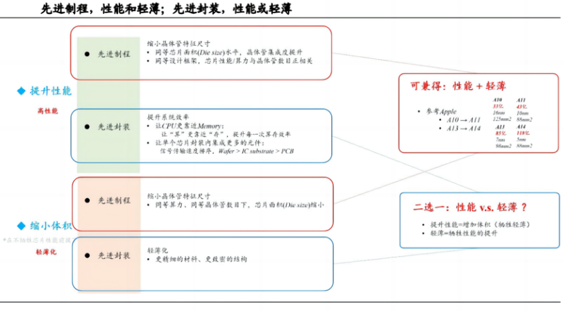 在高性能和轻薄化两个方向上,先进制程可以做到兼顾,而先进封装则有取舍。比如,APPLE的A系列芯片,从A10升级到A11时,由16 nm工艺提升至10 nm工艺,芯片面积从125 mm2减小至88 mm2,而晶体管集成数则由33亿颗增加至43亿颗;A系列芯片从A13升级到A14时,晶圆工艺从7nm升级到5nm,芯片面积从98 mm2减小至88 mm2,而晶体管集成数则由85亿颗增加至118亿颗,做到了性能提升和轻薄化的兼顾。而先进封装,要做到芯片性能提升,因为封装对晶体管尺寸微缩没有效果,提升性能一是增加芯片内部各元件的协作效率,二是往一个系统中堆叠更多的元件(本质上也是提升了系统内的晶体管数据),代价就是系统体积、面积更为庞大,即先进封装提升性能的代价是牺牲轻薄,实现轻薄的代价是牺牲性能的提升。
