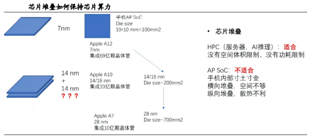 在先进制程不可获得的情况下,通过芯片堆叠(先进封转/Chiplet)和计算架构重构,以维持产品性能。以APPLE的A系列芯片参数为例,A12、A10、A7芯片分别采用7 nm、14/16 nm(Samsung 14 nm、TSMC 16 nm)、28 nm制程。A系列的手机AP芯片,通常芯片面积(Die Size)在约100 mm2大小。在这100 mm2大小的芯片上, A12、A10、A7芯片分别集成了约69亿、33亿、10亿颗晶体管。下面,我们简单进行算术换算,讨论降制程如何维持芯片的算力。如果芯片工艺从7 nm降至14 nm,A12芯片上7nm工艺集成69亿颗晶体管,如果用14 nm工艺以试图达到接近的算力,首先要保证晶体管数目与A12芯片一致,即~70亿颗,且在未考虑制程提升对单个晶体管性能有显著提升的背景下,14 nm工艺的芯片需要两倍于7 nm工艺的面积,即~200 mm2;如果芯片工艺从7 nm降至28 nm,参考28 nm的A7芯片只集成了10亿颗晶体管,如果要达到70亿晶体管数目,则需要将芯片面积扩大至~700 mm2。芯片面积越大,工艺良率越低,在实际制造中得到的单颗芯片的制造成本就越高,因此,在先进制程不可获得的背景下,降制程而通过芯片堆叠的方式,的确可以一定程度减少算力劣势,但是因为堆叠更多芯片,需要更大的IC载板、更多的Chiplet小芯片、更多的封装材料,也导致因为制程落后带来的功耗增大、体积/面积增加、成本的增加。因此,比如,通过14 nm的两颗芯片堆叠,去达到同样晶体管数目的7 nm芯片性能;通过多颗28 nm的芯片堆叠,去达到14 nm芯片性能。此种堆叠方案在HPC(服务器、AI推理)、基站类大芯片领域可能有适用价值,但对于消费电子领域如手机AP芯片和可穿戴芯片,在其应用场景对空间体积有严苛约束的条件下,芯片堆叠则较难施展。
