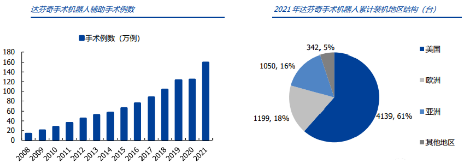 厚积而薄发,商业化开启后销量快速增长。截止至2021年末,达芬奇手术机器人完成了全球1347台系统安装,较2020年增长了43.91%,2001-2021年CAGR为18%;全球累计安装达6730台,其中美国仍是主要市场。由于全球对此产品的安装增加,用达芬奇手术机器人进行辅助手术的例数也持续增长,2021年达芬奇手术机器人辅助手术量已达159.4万例。