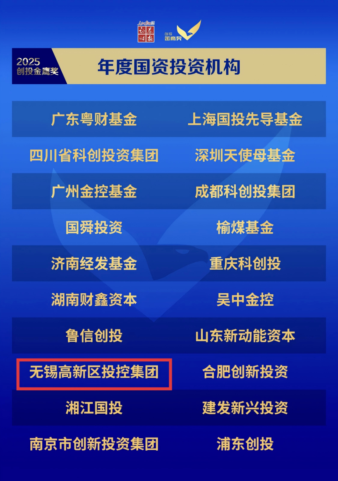 7 月 25 日,由人民日报社主管、证券时报社主办的 “寻找创投金鹰 发掘企业新苗” 计划评定结果公布。经过两个多月的申报、投票、评选,近 300 家机构和企业比拼后,无锡高新区投控集团凭借投资领域的专业能力与业绩表现,荣获【年度国资投资机构】奖项。