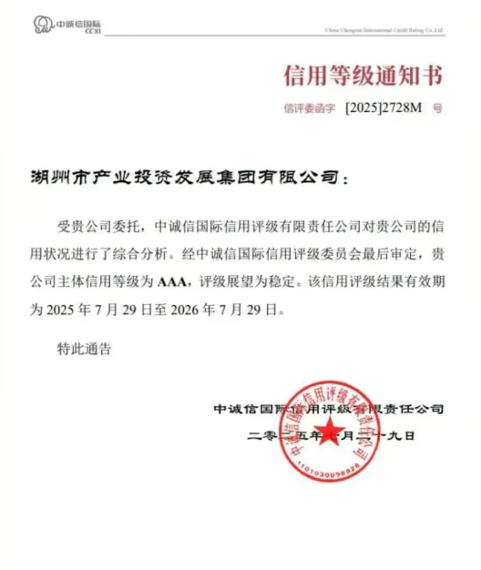 |湖州产业集团成功获评AAA主体信用“双评级”