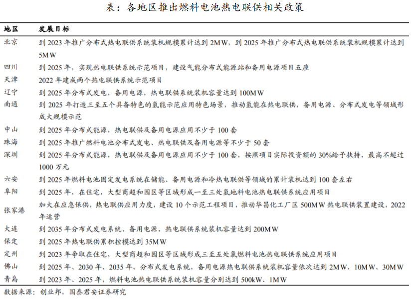 美日等国 SOFC 热电联供发展较为成熟,我国处于积极拓展阶段。微型热电联供用于家庭或小型商业建筑同时提供热量和电力,系统发电时产生的余热可为用户提供热水及采暖系统,以避免长距离运输电力的约6-8%能量损失,达到节能效果。目前美日已实现了燃料电池微型热电联产商业化,美国BE 公司生产的固体氧化物燃料电池发电系统(SOFC)主要用于数据中心和办公楼宇等商业用户,日本通产省自2005 年起启动ENE-FARM 计划,由松下、东芝、爱信精机等生产商负责开发700-750W 家用燃料电池热电联供系统。中国燃料电池微型热电联产处于起步阶段,潮州三环牵头承担“可再生能源与氢能技术”重点专项项目“固体氧化物燃料电池电堆工程化开发”于2019 年启动,此外,潍柴动力、佛燃集团也相继布局该技术路线。目前,河北省、天津市、广市、上海市等多地计划推出燃料电池热电联供试点项目。