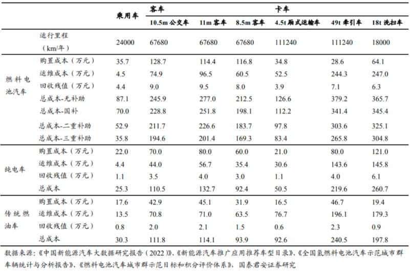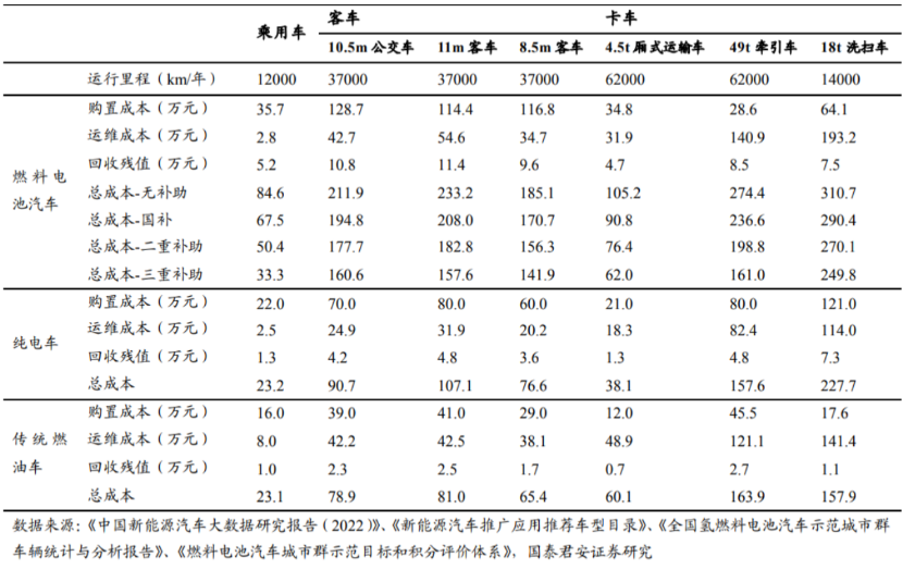 根据氢燃料电池汽车、纯电动汽车和传统燃油汽车的购置成本、政府补贴、燃料成本等相关数据,测算三类车型在低运行里程和高运行里程下的全生命周期成本。关键假设包括: