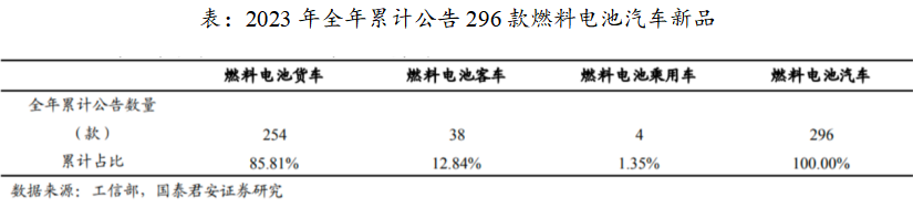2023年工信部发布296 款燃料电池汽车新品,覆盖汽车全领域。2023 年,工信部共发布296 款燃料电池汽车,其中燃料电池货车254 款,客车38 款,乘用车4 款。