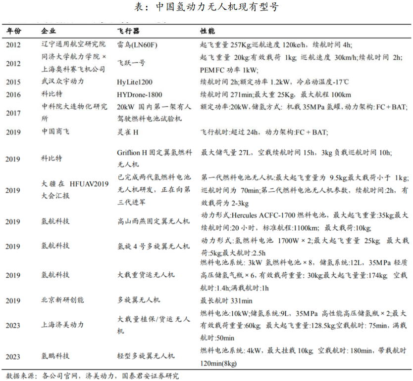 国内氢燃料电池飞机主要应用于植保、货运,将受益政策驱动。2023 年10 月,工业和信息化部等四部门发布《关于印发绿色航空制造业发展纲要(2023-2035年)》,到2025 年,国产民用飞机节能、减排、降噪性能进一步提高,使用可持续航空燃料的国产民用飞机实现示范应用,氢能源飞机关键技术完成可行性验证。到2035 年,建成具有完整性、先进性、安全性的绿色航空制造体系,新能源航空器成为发展主流。国内氢燃料电池飞机早在2012 年已有产品发布,主要是应用于植保、货运的无人机,目前氢航科技的大载重货运无人机已实现最大载重174kg,续航1h 的飞行。