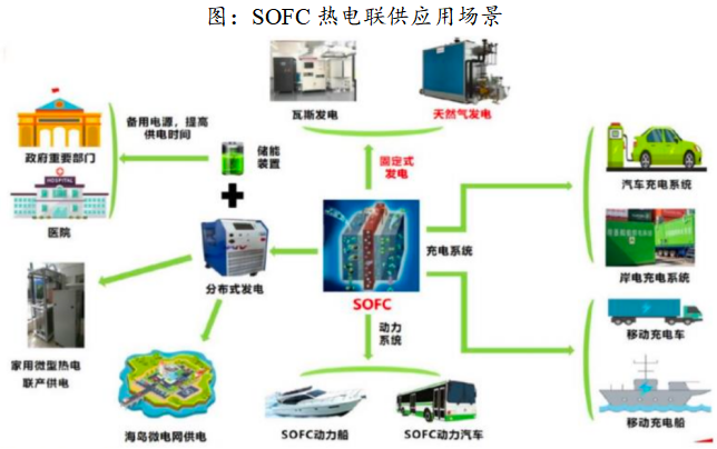 SOFC 不局限于氢气燃料,发电排气温度高更适于热电联供。SOFC 是一种先进的燃料电池技术,具有发电效率高、不使用贵金属等特有优势,此外,所需的氢气可以通过外部或内部重整技术从天然气等碳氢化合物中提取,因此燃料可以是氢气或者甲烷等含碳气体。由于SOFC 发电的排气温度很高,具有较高利用价值,不仅可提供天然气体重整所需热量,而且可以用来生产蒸汽,更可以和燃气轮机组成联合循环,因此在大型集中供电、中型分电、小型家用热电联供等民用领域作为固定电站,以及作为船舶动力电源、交通车辆动力电源等移动电源,具有广阔的应用前景。
