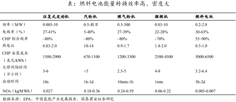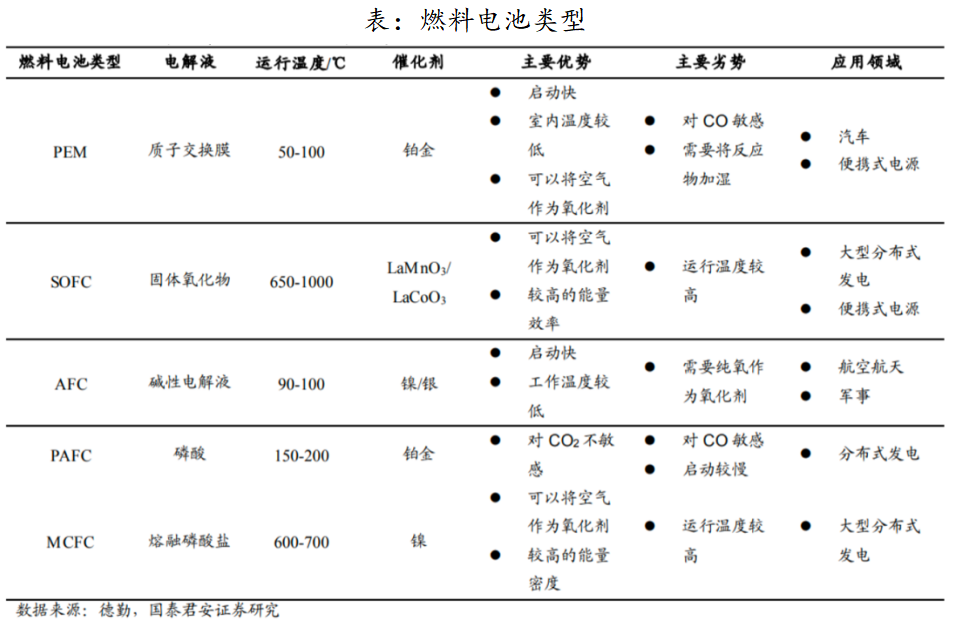 PEM 适用于交通,SOFC 适用于分布式发电。燃料电池技术根据电解液的不同可以分为 5 大类:PEM、AFC、PAFC、SOFC、MCFC,其中PEM 能够在50-100℃下运行,启动时间短,空气可作为氧化剂来源,因而成为交通能源的首选技术路径。而SOFC 及MCFC 运行温度较高,可将空气作为氧化剂,更适用于大型分布式发电。