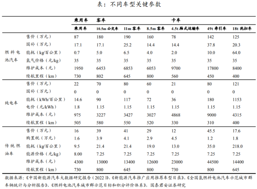 (2)氢气价格按35 元/kg 计算,商用车电价按1.15 元/kWh,油价按7.25 元/kg 计算;