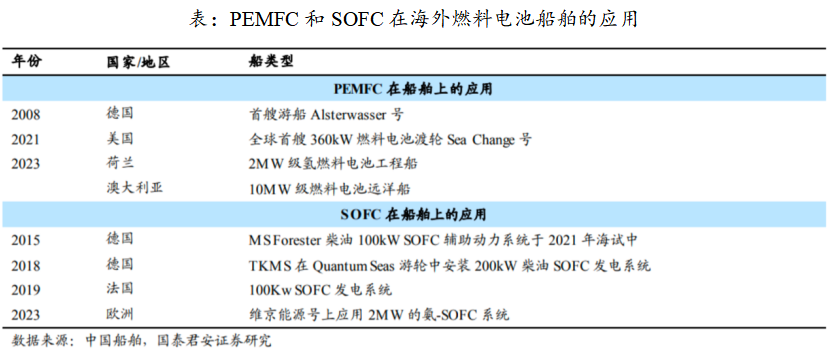氢燃料船舶包括PEMFC和 SOFC两种类型。目前氢燃料船舶进入商业化运营阶段,发展趋势为逐步由内河、沿海船舶到远洋船舶,功率逐步由百千瓦到数兆瓦,燃料电池的类型包括 PEMFC 和SOFC。