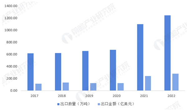 从合成树脂出口规模来看,2017-2020年,中国合成树脂出口量稳步上涨,并维持在600-700万吨之间,2021年中国合成树脂出口量大幅上涨至1096.4万吨,出口金额达241.65亿美元,约为上年出口金额的两倍;2022年中国合成树脂出口量继续上升,为1244.5万吨,出口金额为278.67亿美元。