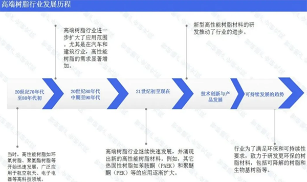 高端树脂行业的发展历程可以追溯到20世纪70年代至今。起初,高性能树脂材料如环氧树脂、聚氨酯树脂等开始迅速发展,并广泛应用于航空航天、电子电器等高科技领域。随着时间的推移,高端树脂行业扩大了应用范围,进一步应用于汽车制造、建筑领域等。在过去的几十年里,高端树脂行业继续迎来技术创新和产品发展。新型高性能树脂材料不断涌现,例如聚酰亚胺(PI)树脂、苯胺酮(PAEK)等,进一步拓宽了应用领域。随着电子电器、航空航天、汽车和能源等行业的快速发展,高端树脂的需求不断增加。如今,高端树脂行业正趋向可持续发展。行业致力于研发更环保的树脂材料,包括可降解的树脂和生物基树脂等,以应对环境保护要求的挑战。同时,行业也注重提高能源效率和环境友好性,减少对环境的不良影响。
