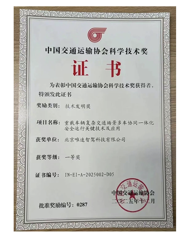 近日,中国交通运输协会正式颁发了2025年度科学技术奖获奖证书。北京唯速智驾科技有限公司(以下简称“唯速智驾”)凭借“重载车辆复杂交通场景多车协同一体化安全运行关键技术及应用”项目,荣获技术发明奖一等奖!